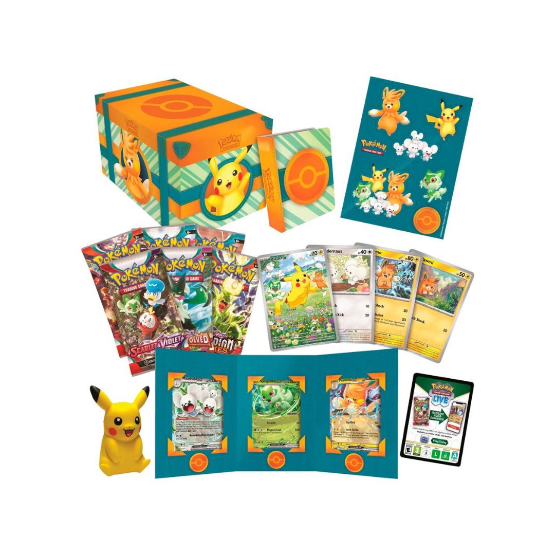 A world of adventure awaits Pokémon Trainers in the Paldea region! Gear up for battle with a big handful of ready-to-play promo cards featuring cute yet feisty Pokémon, then open up a set of booster packs to find even more friends! Along the way, you’ll get to decorate your gear with tech stickers, show off your collection with a mini portfolio, and give a squishy toy Pikachu a squeeze!