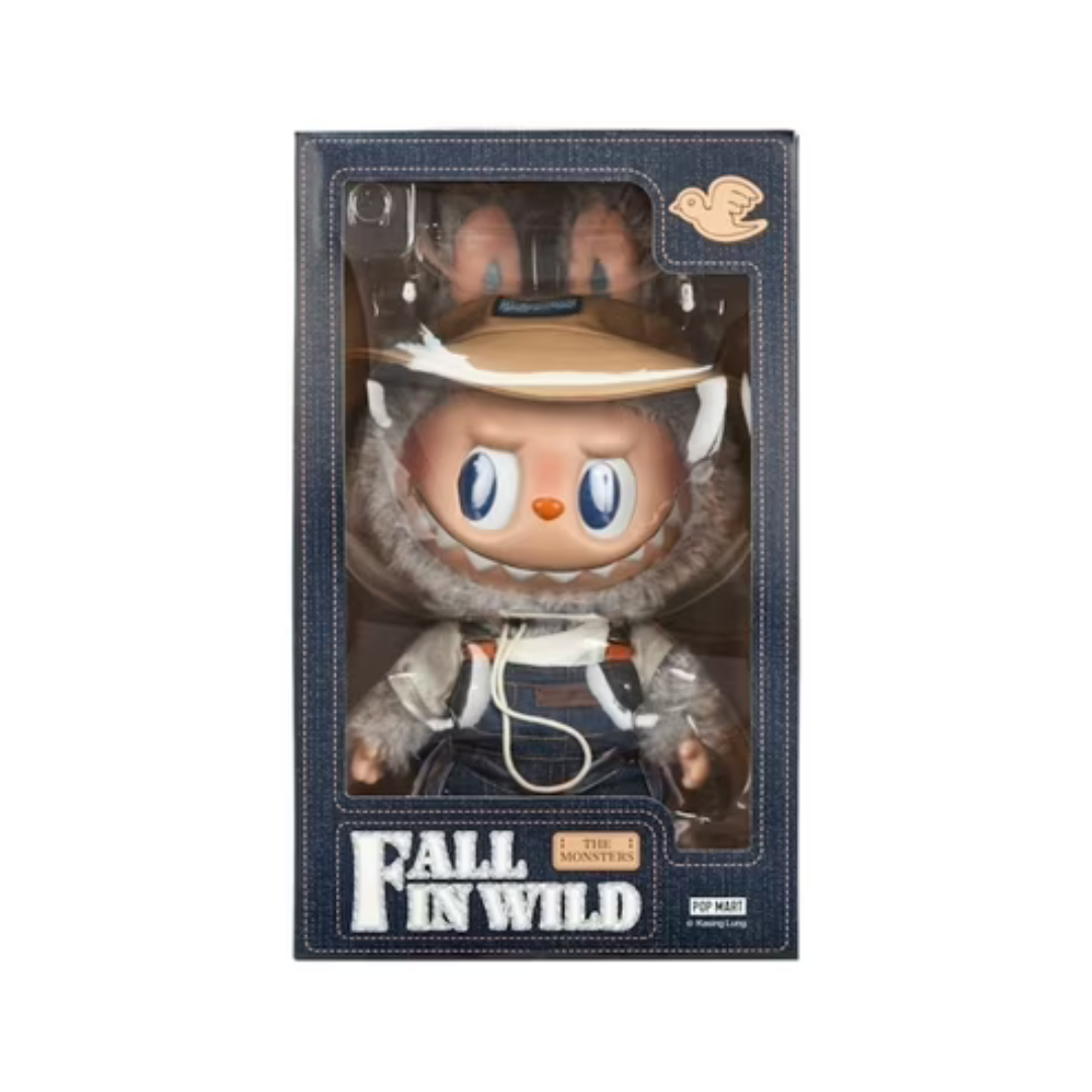 This collectible The Monsters Fall In Wild Vinyl Plush Doll Pop Mart LABUBU features an "in the wild" theme. The doll, which stands almost 16 inches tall, features a character wearing denim overalls over a white t-shirt. He also wears work boots and a brown bucket hat with a "The Monsters" logo on the front. The fur on his body, mainly on his arms, around his head, and on his ears, is white plush material, while the face and hands are made of vinyl. The face has big blue eyes and a wide smile with pointy teeth showing.