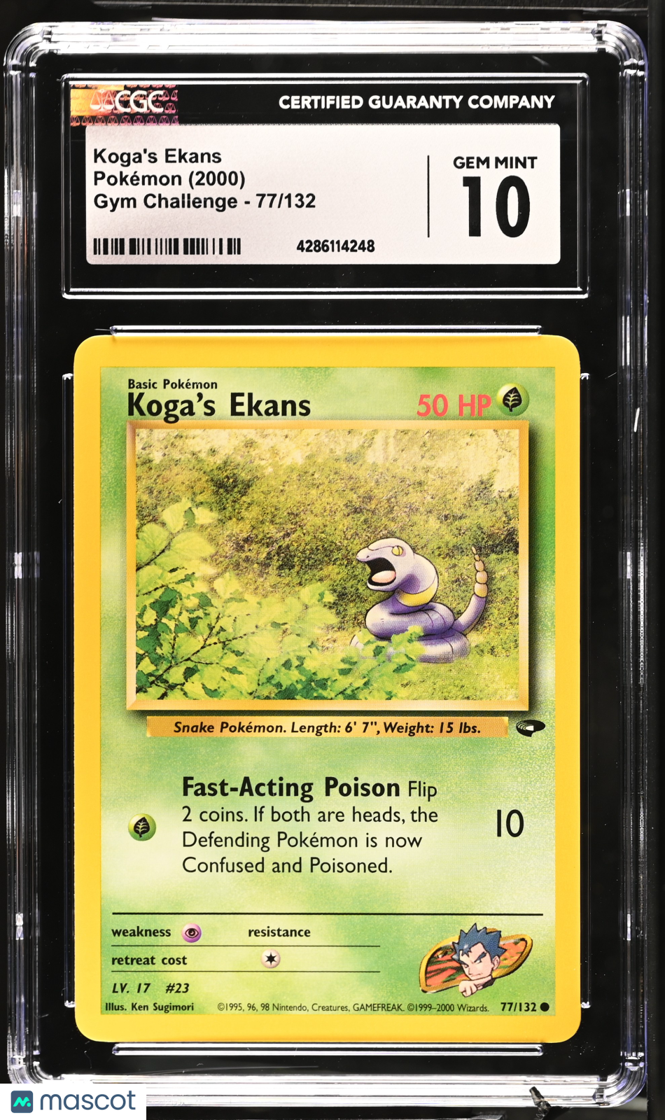 You are purchasing a 2000 Pokemon Koga's Ekans #77/132 CGC 10. You will receive the exact item in the photographs. Thank you for looking. Listed With Mascot.