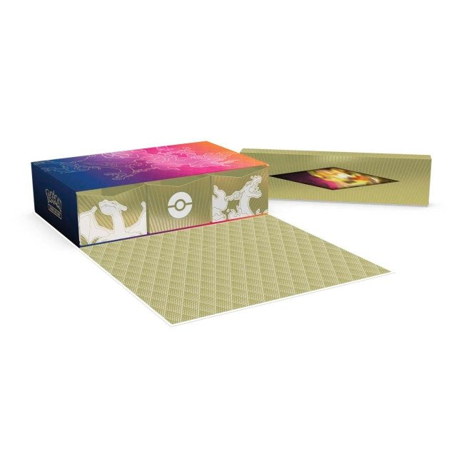Celebrate the Sword & Shield Series and the era of Pokémon V, Pokémon VMAX, and Pokémon VSTAR with a hotshot who knows how to put all that power to good use! Charizard turns up the heat as a trio of promo cards with an etched foil treatment, and its Gigantamax form shows off blazing style on a playmat, metal coin, and set of card sleeves. Metal dice and condition markers round out this ultimate set of gameplay accessories. And as you open the huge stack of booster packs inside this box, take a journey through the Sword & Shield Series with an original booklet full of images and stats!